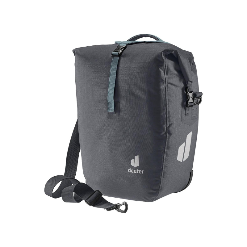 This waterproof pannier keeps contents like sports and leisure gear or travel luggage safe from road spray and rain. The roll-top closure with two-way zipper lets you extend the capacity by 5 liters. deuter ’s newly developed BagFix quick-release system leaves you free to pedal in peace, with the bike bearing the brunt of the load – and nothing on your back. A quick pull on the release handle and the bag is detached and ready to use as a shoulder bag. And with a detachable shoulder strap and an adjustable grab handle / closure strap that doubles as a gear strap to attach a sleeping mat or jacket, plus a built-in organizer unit, the sky’s the limit for what this bag can do.