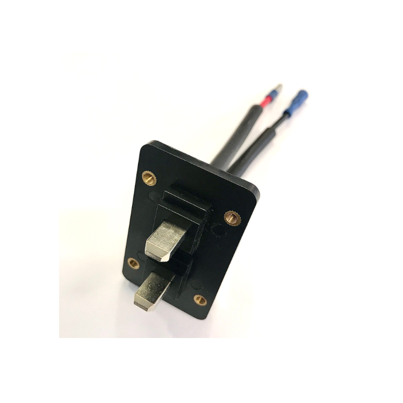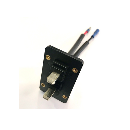 Replacement part for the part on the Ezee bike frames that the battery is connected to. This part connects the battery output to the controllor via the key switch via bullet connectors.