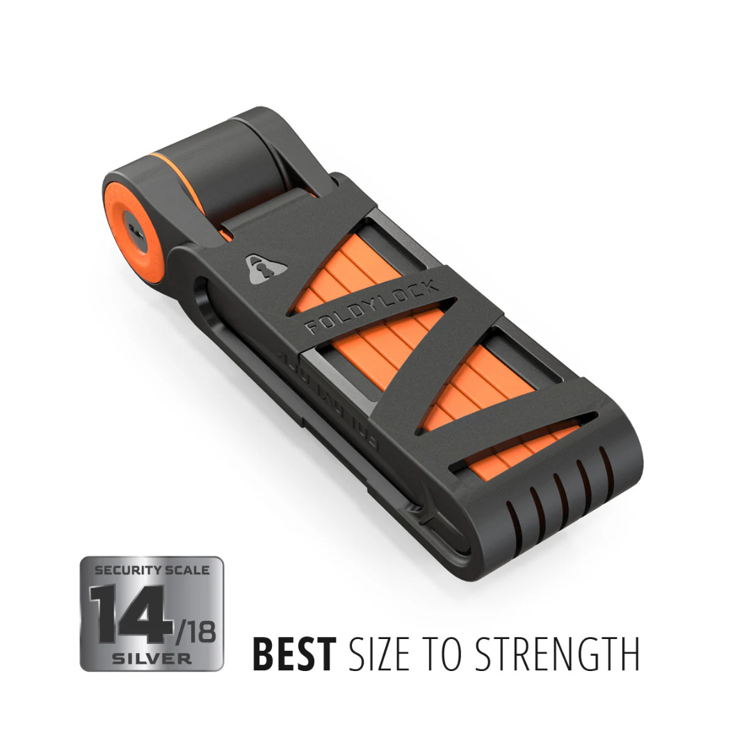 "This handy little folding lock proved to be just the right size. When folded up, it measures a compact 19cm/7.4" x 6cm/2.3", making it one of the smallest and lightest Silver-rated locks available. It features six strong steel bars connected by stainless rivets, creating a secure circumference of 85cm/33.4".